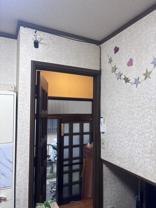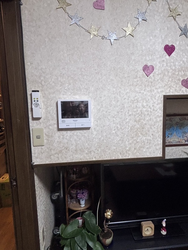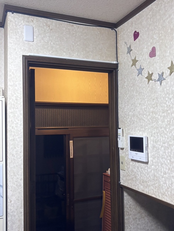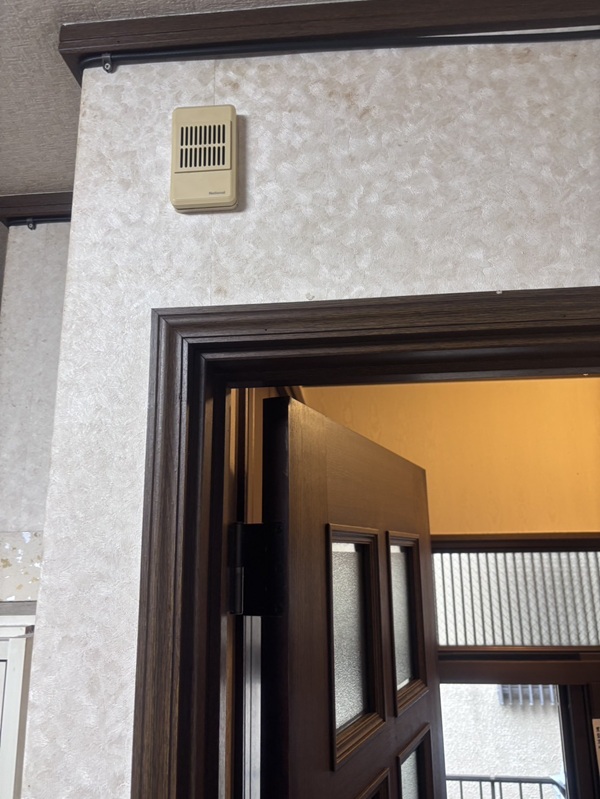 既存はチャイム式で昔ながらの天井の所でチャイムが鳴るタイプで、それを今回はモニタータイプへと交換希望で玄関子機も見えにくい所にある為通路側へと移設希望で室内親機も壁の所へとご希望。