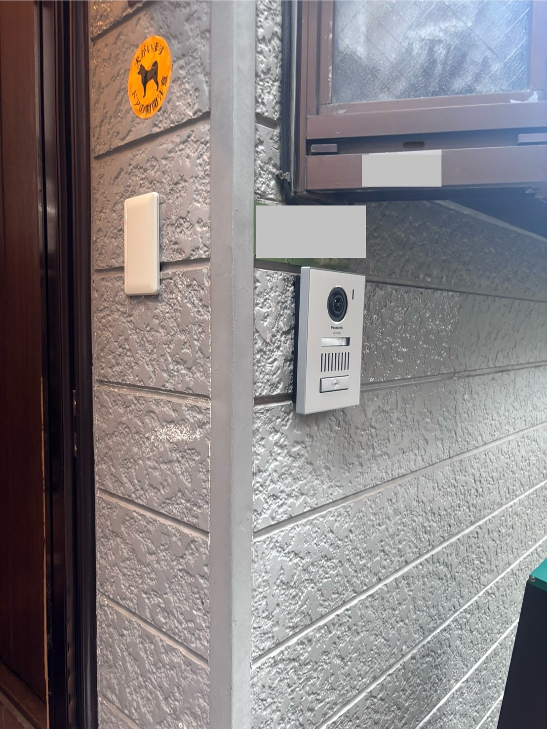 既存玄関子機を外し、通路側へと既存の所から穴を開けインターホン線も延長して設置。
