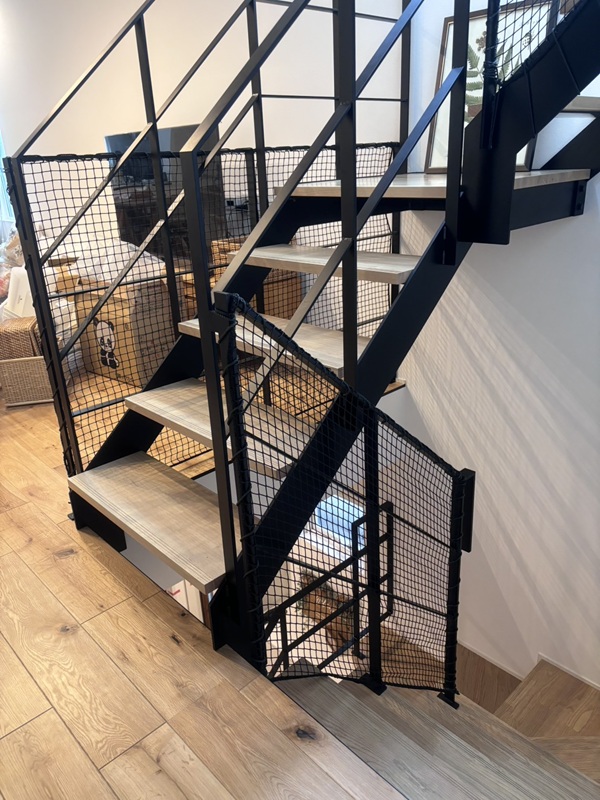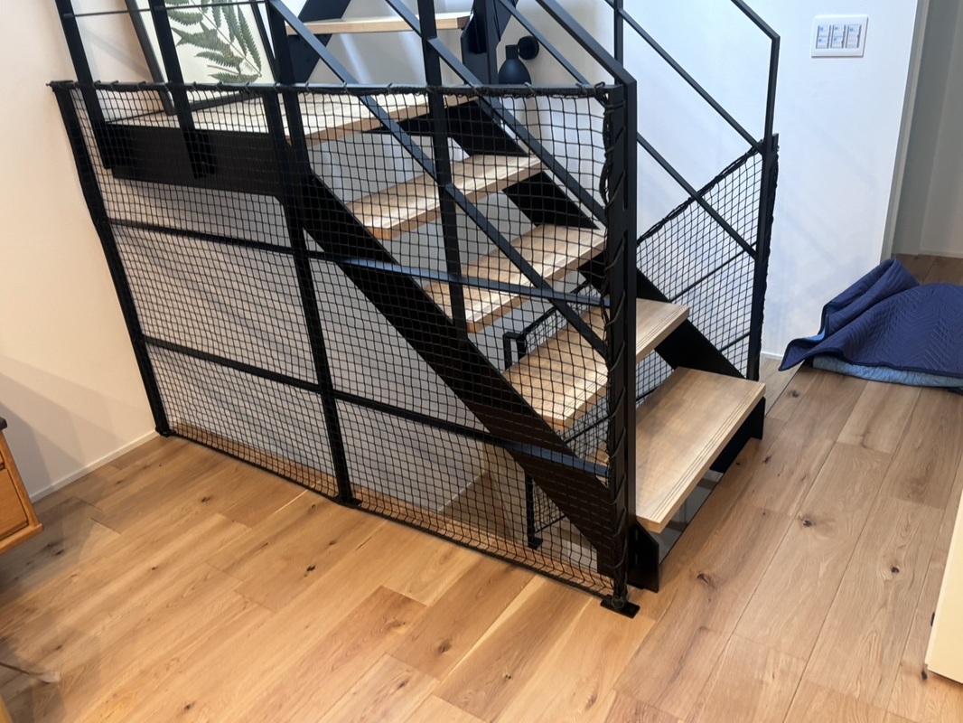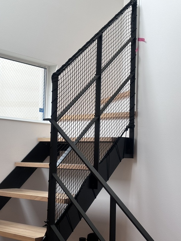 お子様落下防止や手摺りの隙間から物が落ちるのを防止する為ネット設置。